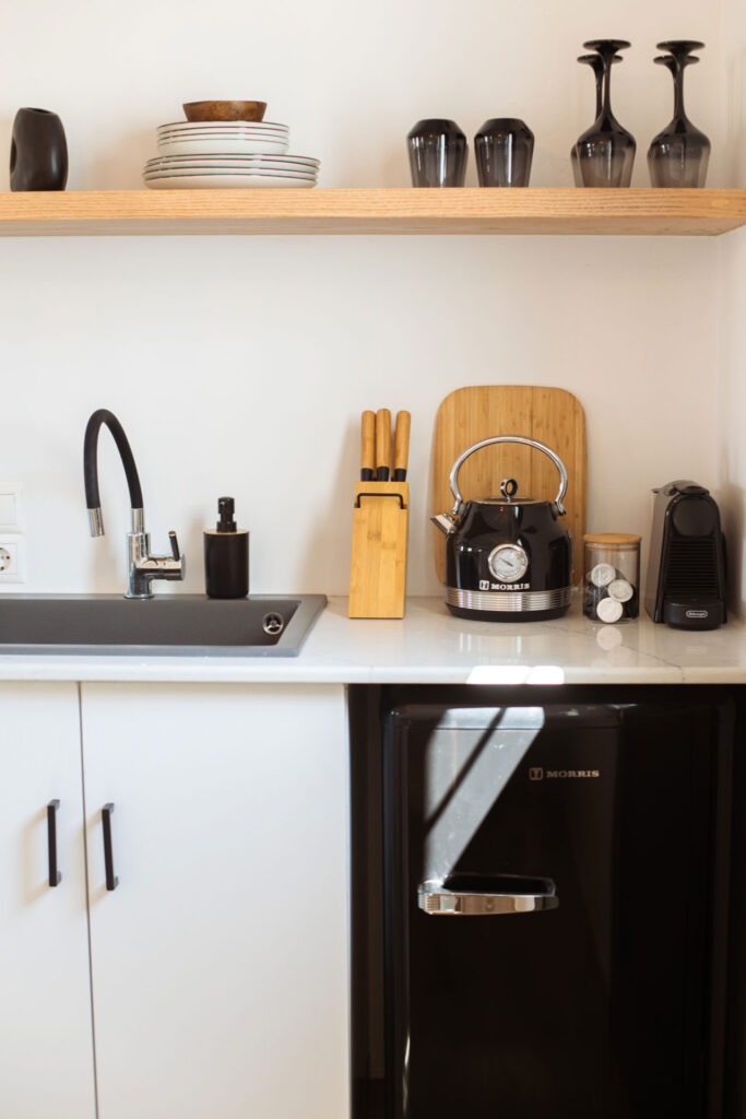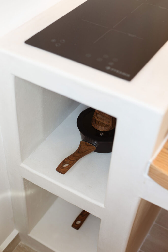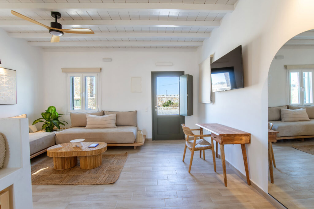 Upon entering, you’ll be greeted by a stylish living room that blends contemporary design with classic Cycladic elements, providing a relaxing space for unwinding.