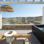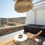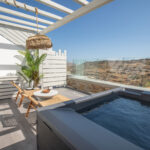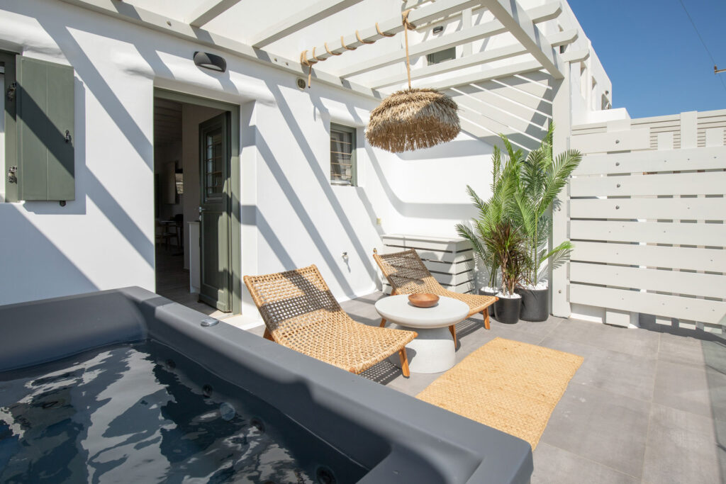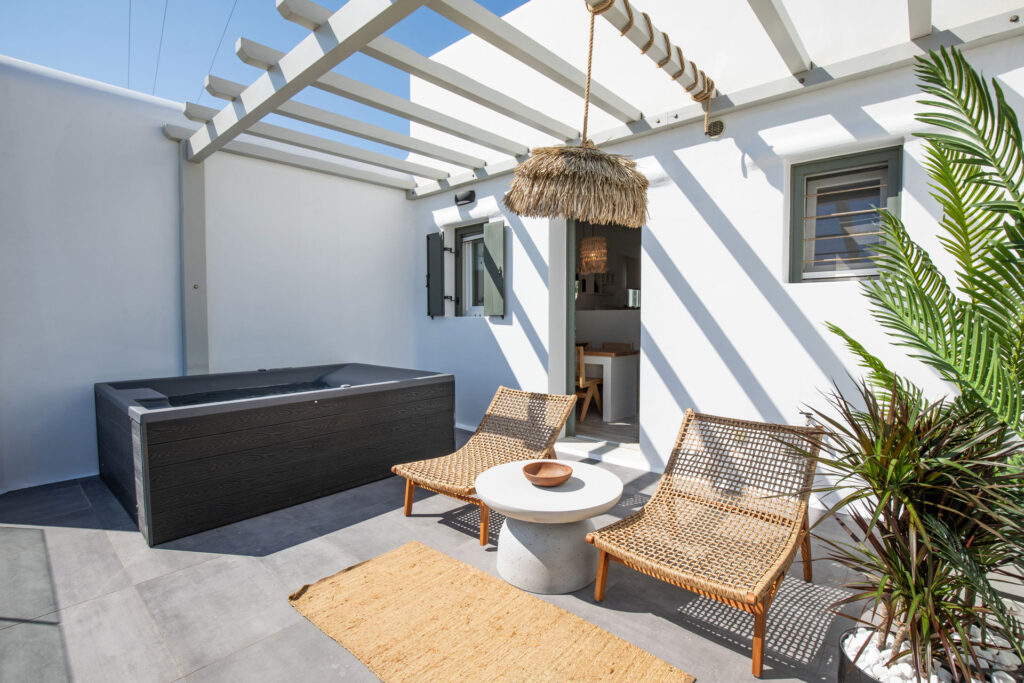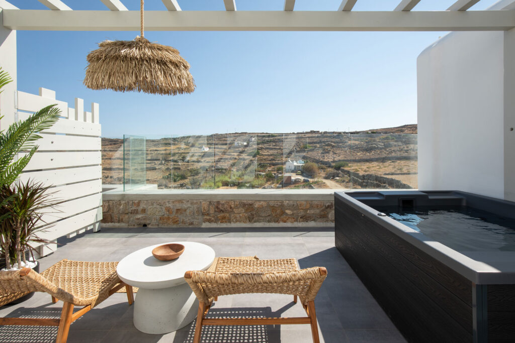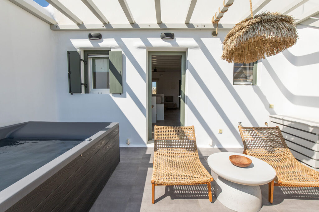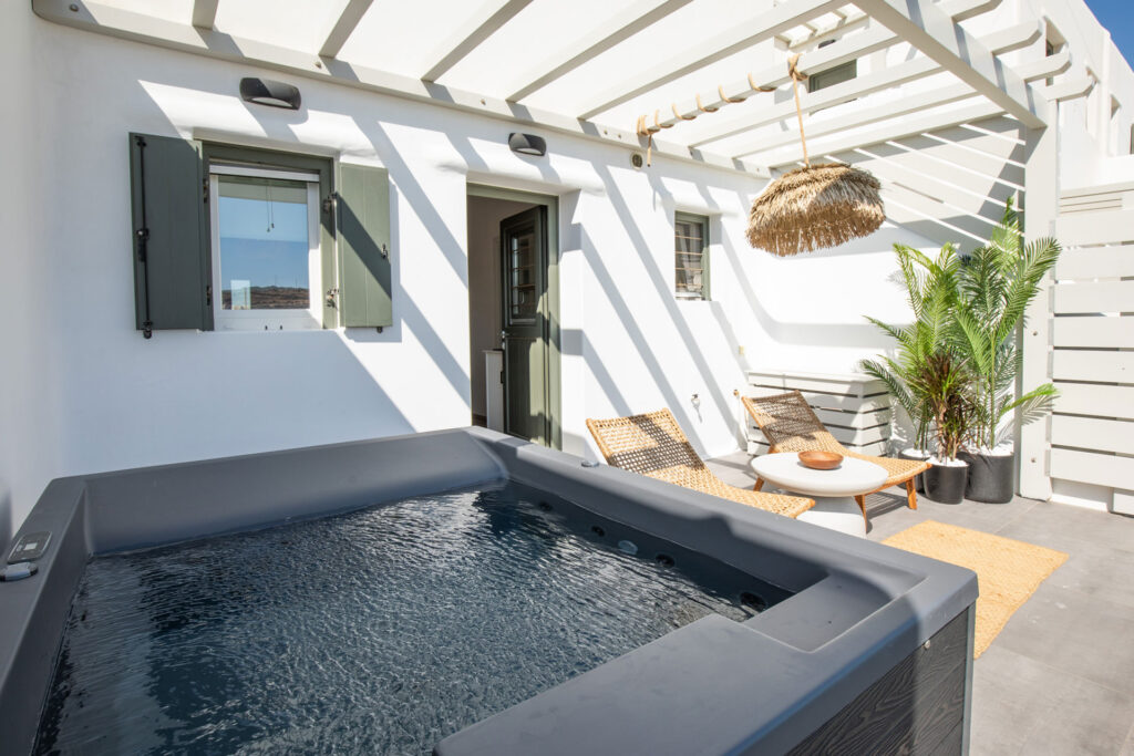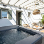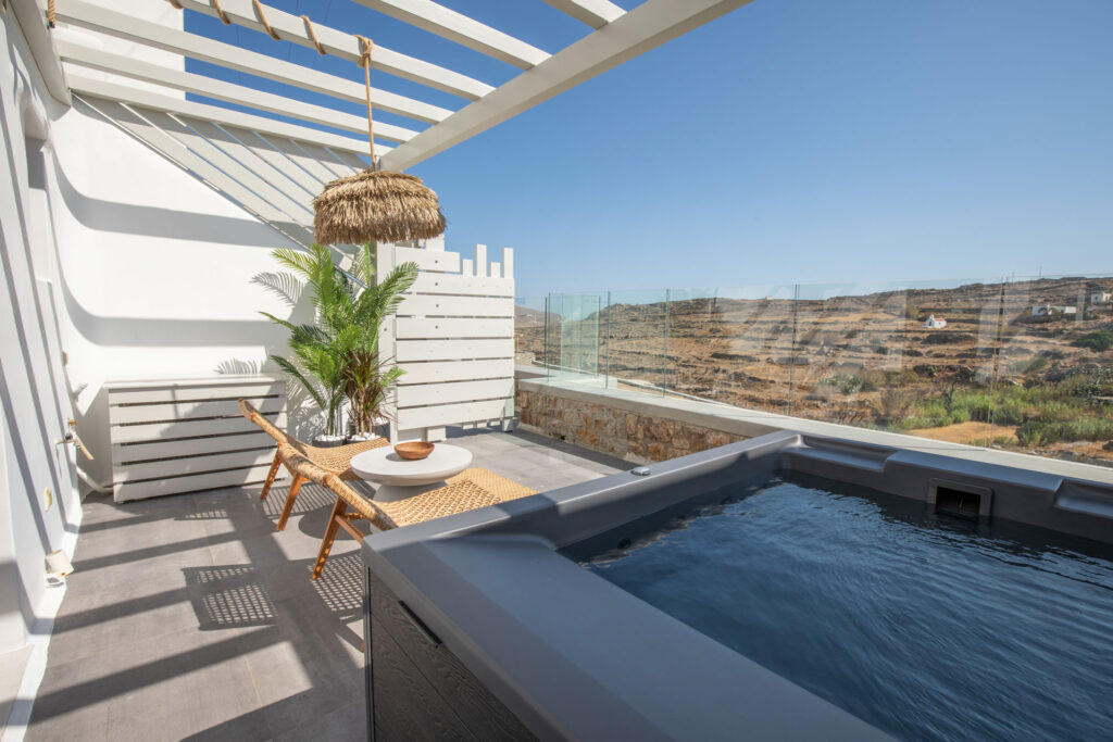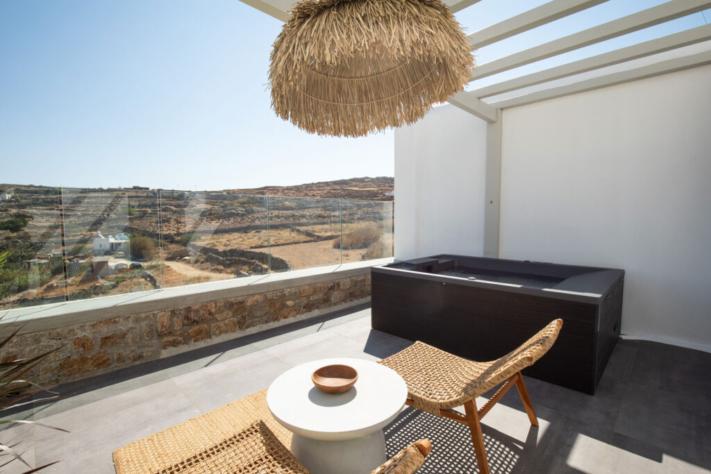 The bedroom is a serene retreat with comfortable bedding and tasteful decor, ensuring a restful night’s sleep. Step outside to the private patio, where you can soak in the hot tub while enjoying stunning views, offering a perfect spot for relaxation and taking in the beauty of Mykonos.